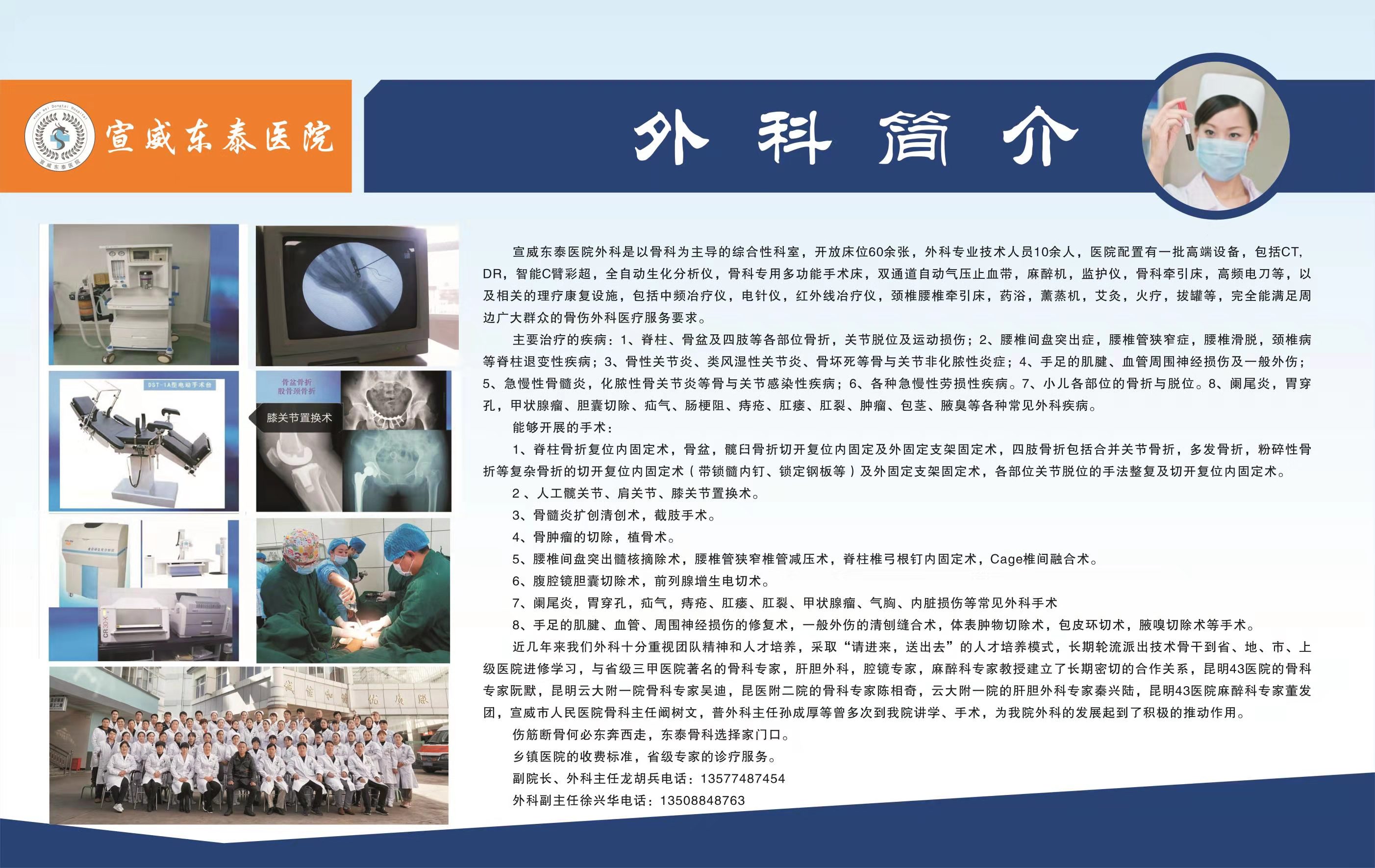 宣威东泰医院外科是以普外科、骨科为主导的综合性科室,开放床位60余张,外科专业技术人员10余人,医院配置有一批高端设备,包括 腹腔镜、CT 、DR 、智能 C 臂、彩超,全自动生化分析仪、骨科专用多功能手术床、双通道自动气压止血带、麻醉机、监护仪、骨科牵引床、高频电刀等,以及相关的理疗康复设施,完全能满足周边广大群众各种外科常见病的诊疗服务要求。