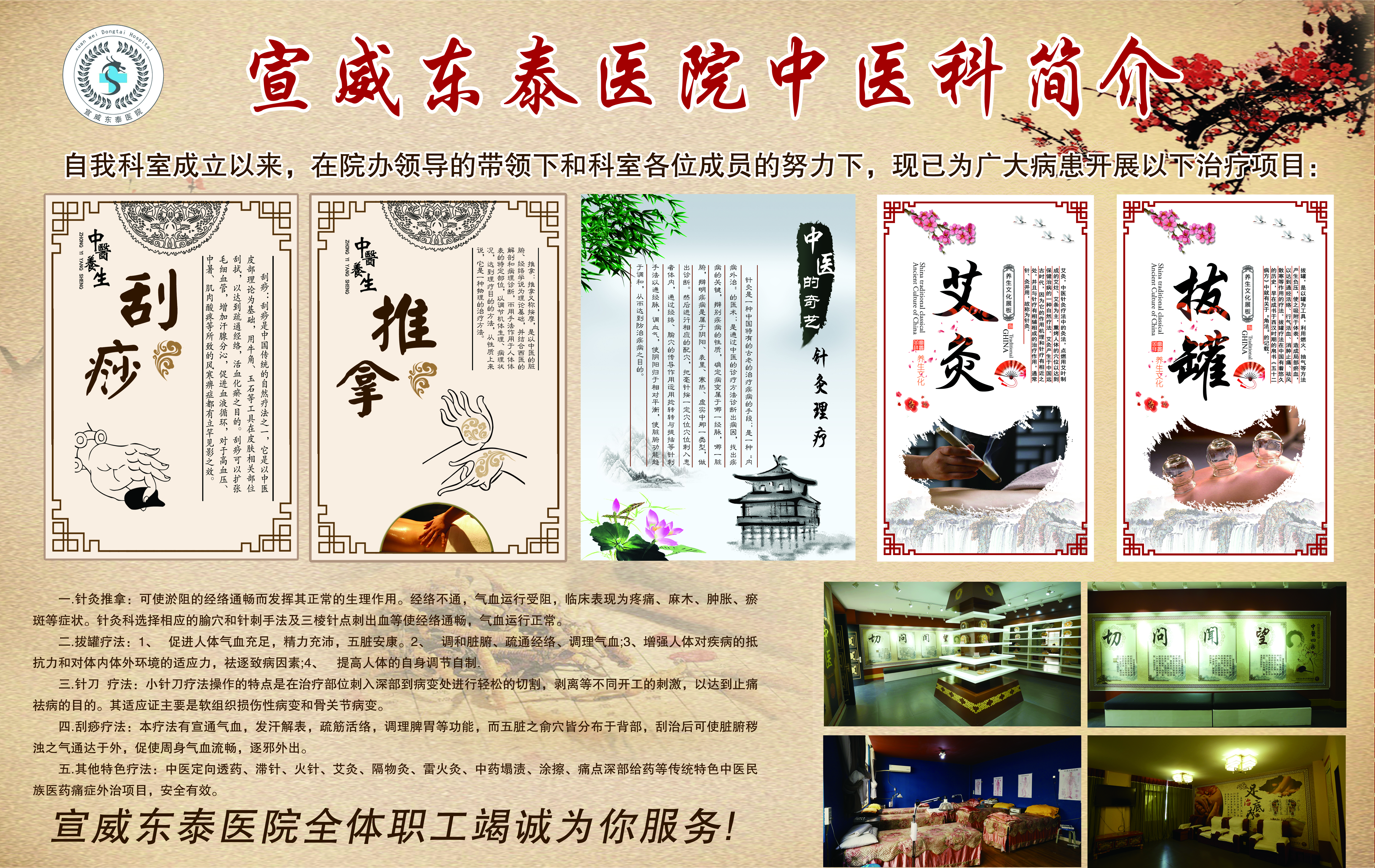 宣威东泰医院中医科,在发展中始终以继承和发扬祖国医学为己任,以中医为本,同时又注重中西医结合,从继承中医到发展中医,将现代医学科学理论与技术应用到中医理论的创新与临床实践中。